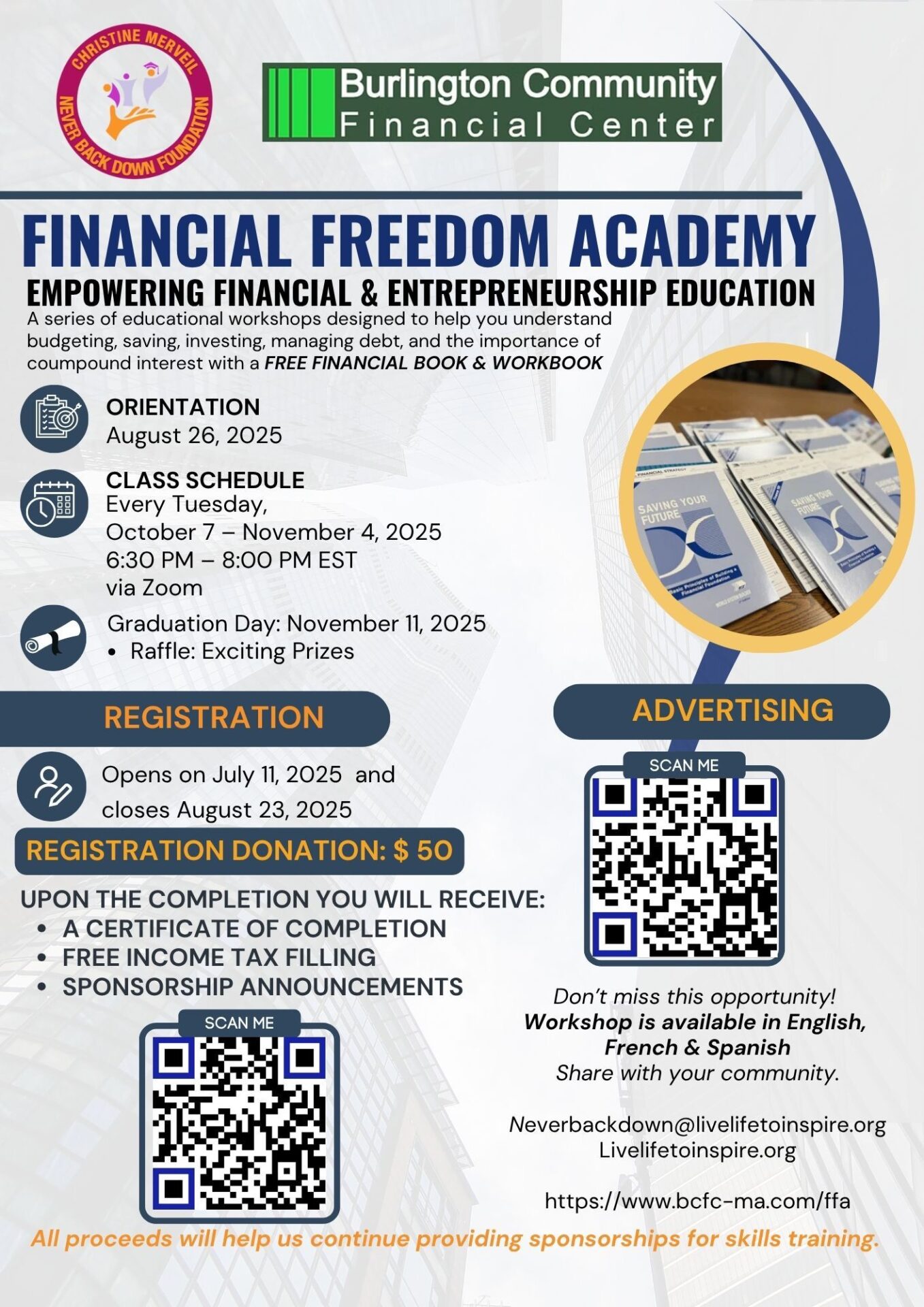 We are proud to announce The Christine Merveil Never Back Down Foundation, Inc. has partnered with Burlington Community Financial Center to provide the Financial Freedom Academy series of educational workshops focused on personal finances, taxes, debt management and entrepreneurship to our community.